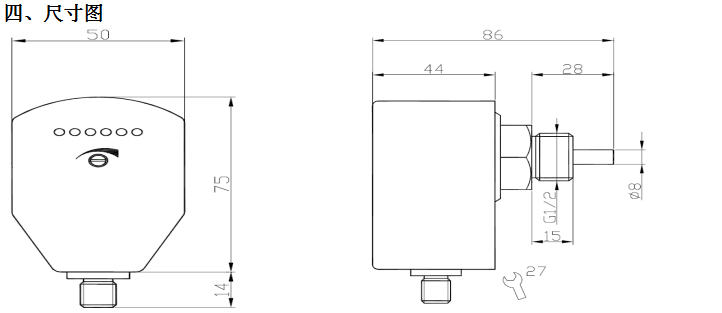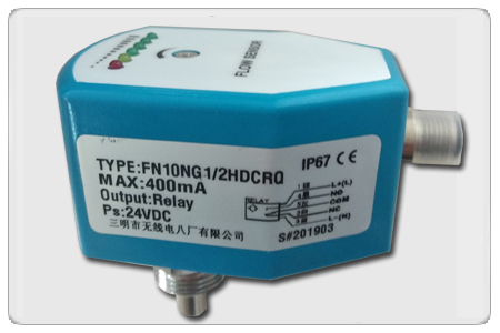 將流量開關(guān)裝好,使介質(zhì)以需要監(jiān)測的流速流動,擰開面板上的螺絲,調(diào)整電位計, 使第一個綠色LED怡好變亮。此后當流速低于當前值時,開關(guān)就釋放(紅燈亮)。若要使開關(guān)點比當前流速小,可調(diào)整電位計(順時針旋轉(zhuǎn)螺絲刀)使綠色 LED多亮一些。