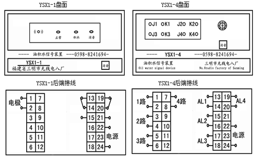 YSX1油積水信號裝置安裝于油箱底部。當油箱內(nèi)油混有水并沉積于底部電極裝置時,信號裝置內(nèi)的集成控制電路能發(fā)出報警信號,運行人員可打開電極裝置的Gl/4直嘴旋塞把水放掉。YSX1-1為一路監(jiān)測配套儀表;YSX1-4為4路監(jiān)測配套儀表。